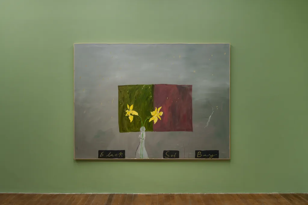 An oil on canvas painting, that depicts two daffodils in a jar, in front of a Mayo flag, amidst a grey, wintery sky. The words ‘Black Sod Bay’ are written along the bottom of the canvas.